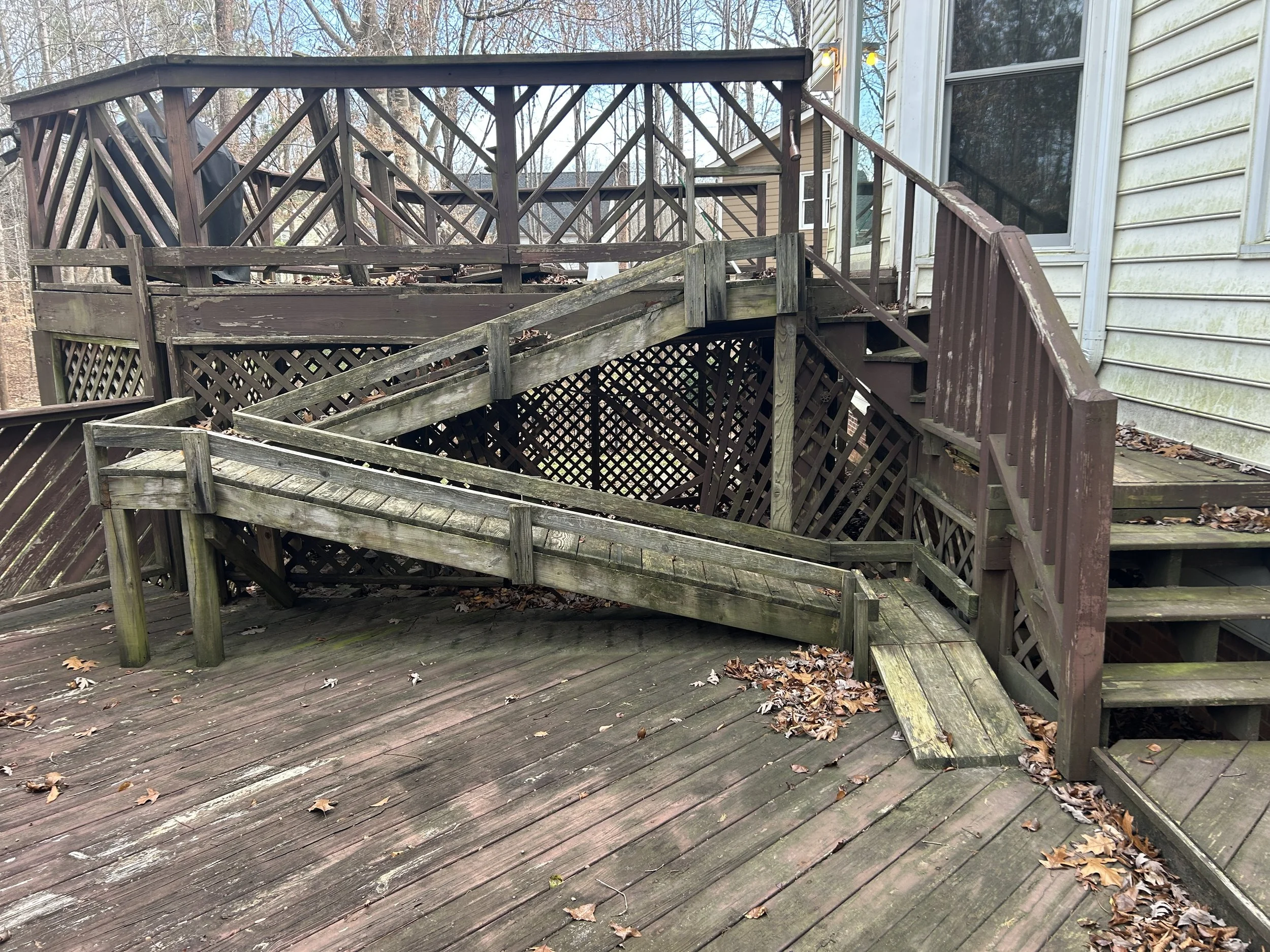 Worn-out boards are carefully removed to expose the deck’s substructure, which is cleaned and prepped for the new surface.